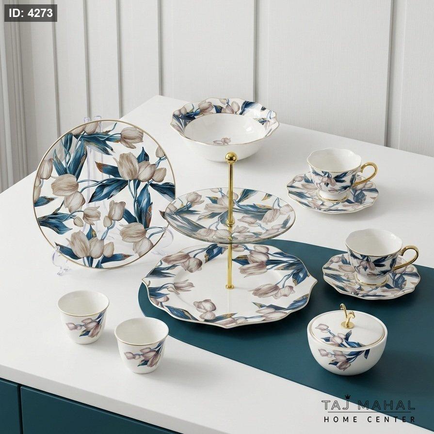 استقبلي ضيوفكِ بفخامة لا تُنسى مع طقم الضيافة المتكامل الذي يجمع بين سحر الطبيعة ورقي التصميم. يتميز هذا الطقم بنقوش زهور التوليب بدرجات الأزرق والأرجواني الهادئ، مع لمسات فنية من الذهب عيار (أو لمسات ذهبية) على الحواف، ليحول مائدتكِ إلى لوحة فنية تعكس ذوقك الرفيع.