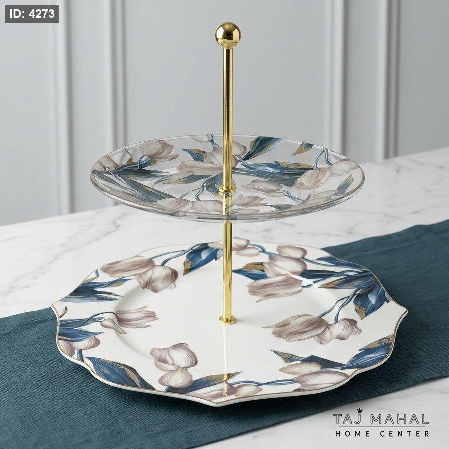 مضيفة (ستاند) طبقتين: قاعدة من البورسلان وطبقة علوية من الزجاج الفاخر، مثالية لتقديم المعجنات والموالح.