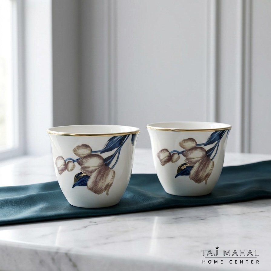 طقم فناجين قهوة عربية بنقوش أزهار رقيقة باللونين الأرجواني والأزرق مع حواف ذهبية