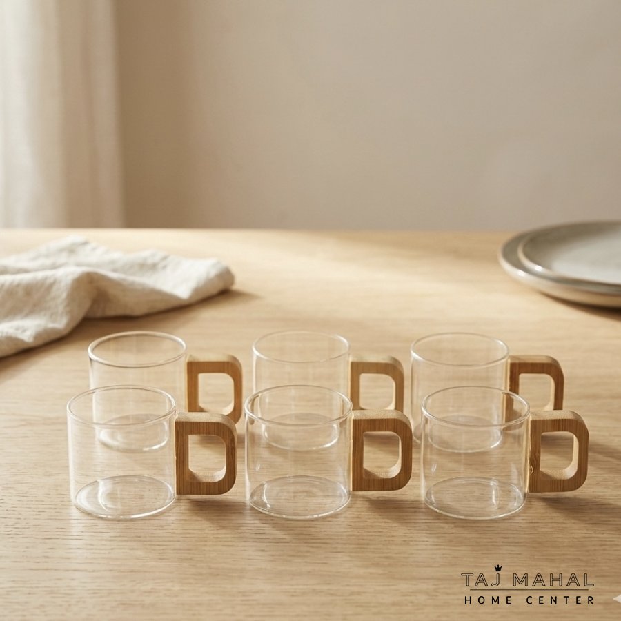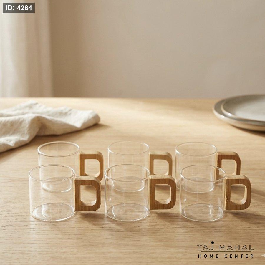 طقم 6 فناجين زجاج مع يد خشبية