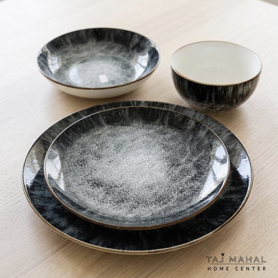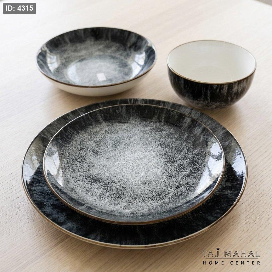 طقم صحون سفرة بورسلان لون أسود رخامي 24 قطعة