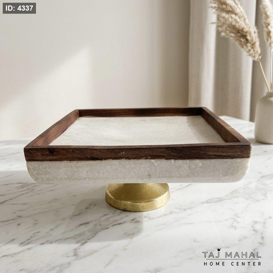 ستاند تقديم مربع بإطار خشب هندي وسطح رخامي بقاعدة ذهبية