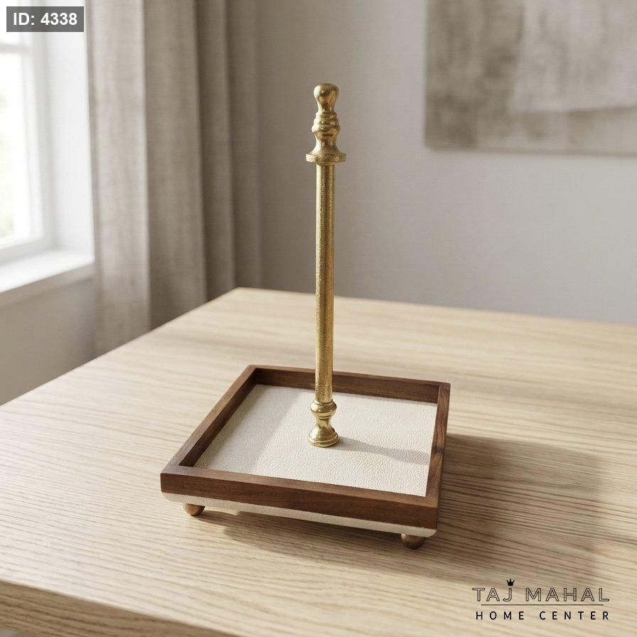 ستاند حامل محارم بقاعدة مربعة رخام وإطار خشب هندي مع عمود معدني ذهبي