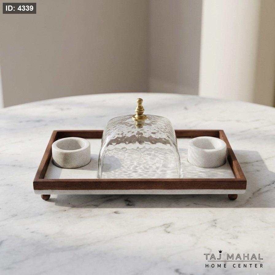 طقم تقديم مستطيلة بقاعدة رخامية وغطاء زجاجي مع ٢ متكة صغيرة وإطار خشب هندي