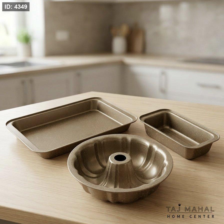 طقم قوالب كيك وخبز مكون من ثلاث قطع أساسية، وهو مصمم بطلاء جرانيت بلون برونزي أو ذهبي منقط (Sandstone effect) ليمنح خاصية عدم الالتصاق وتوزيعاً متساوياً للحرارة.