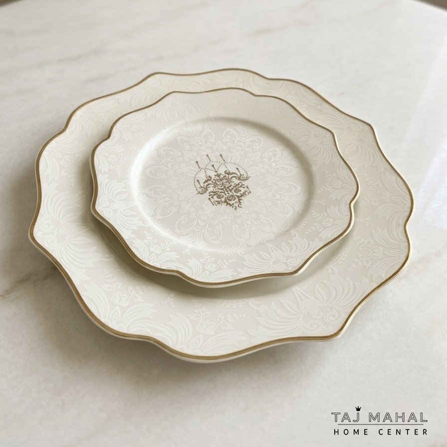 طقم صحون بورسلان بلون أبيض عاجي ملكي وزخارف ذهبية
