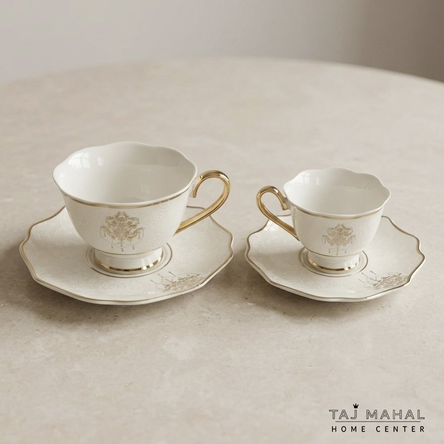 طقم فناجين شاي او قهوة بورسلان بلون أبيض عاجي ملكي وزخارف ذهبية