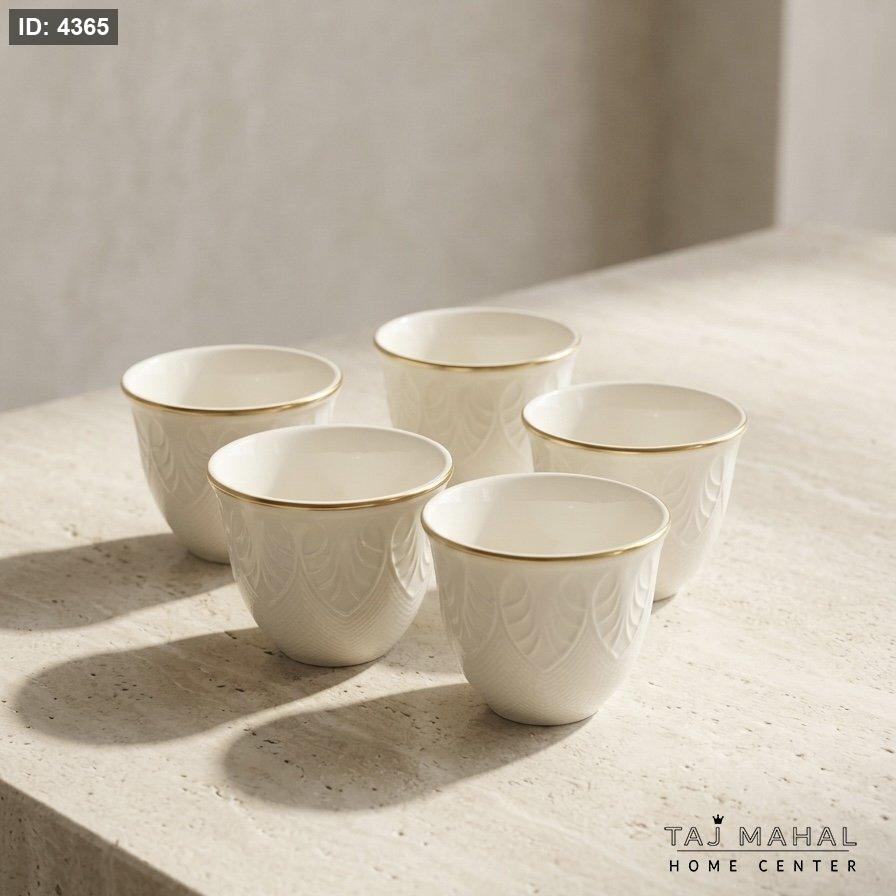 طقم فناجين قهوة بورسلان ابيض مع نقوش بارزة وحافة ذهبية