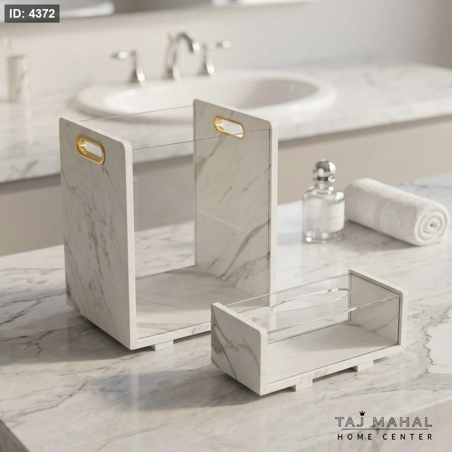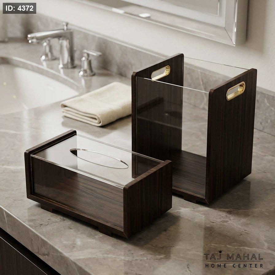 سلة مهملات وعلبة محارم أنيقة مصنوعة من الأكريليك والخشب مع مظهر رخامي