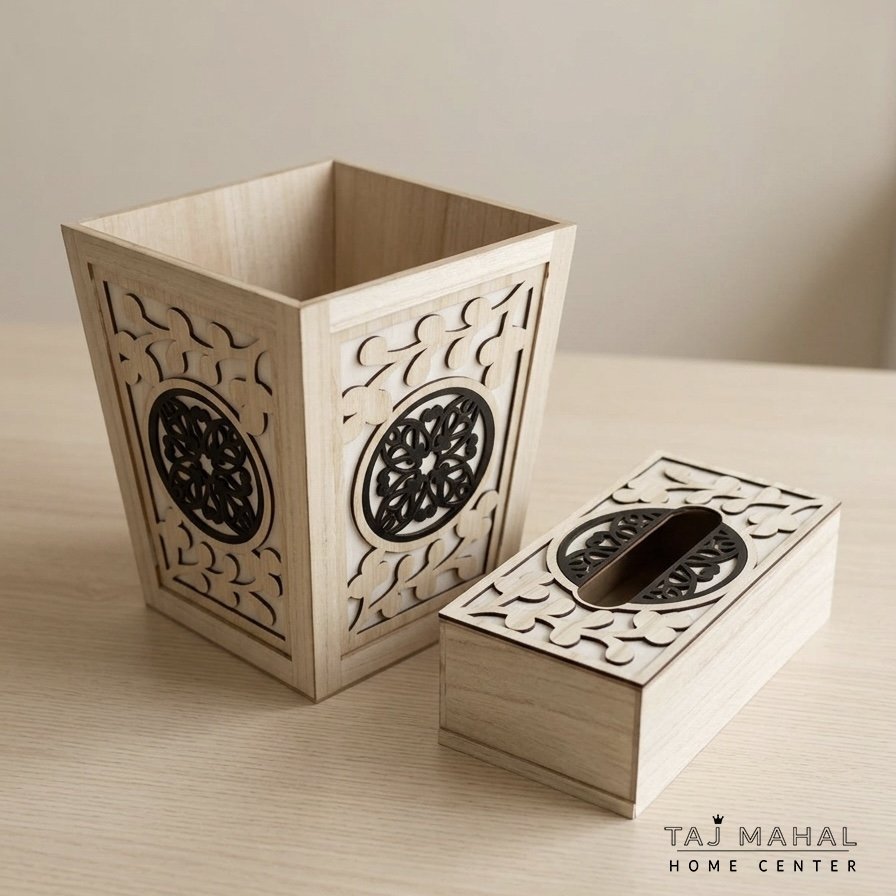 طقم سلة مهملات وعلبة محارم خشب مزخرف بنقوش CNC مفرغة