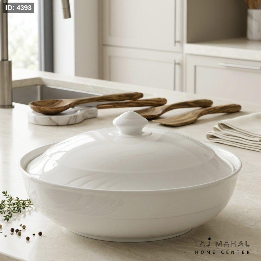 وعاء تقديم عميق بورسلان ابيض مع غطاء