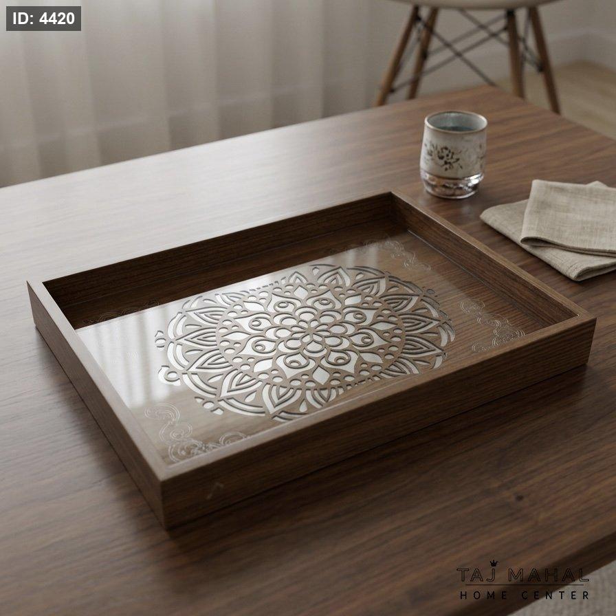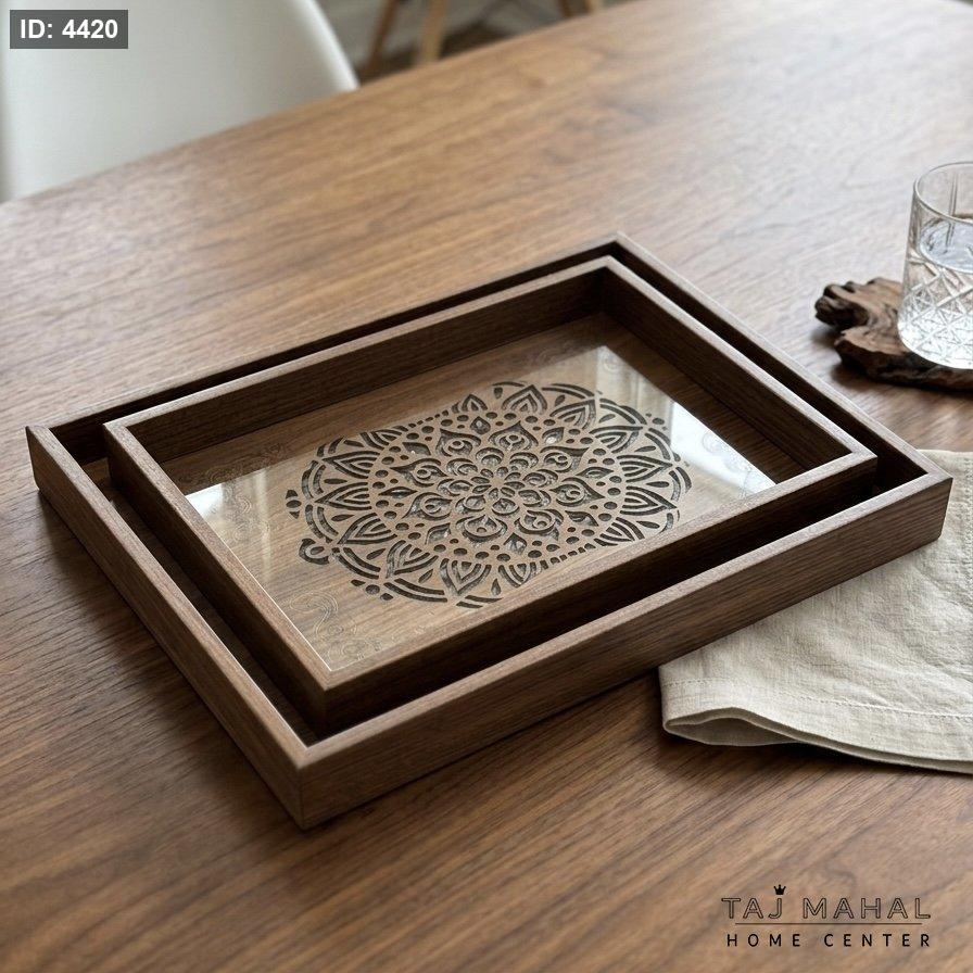 طقم صواني تقديم خشبية بتصميم أرابيسك أنيق، يتميز بقاعدة زجاجية مزينة بنقوش هندسية مفرغة ومحفورة بالليزر، يجمع بين الفخامة والعملية في الضيافة.