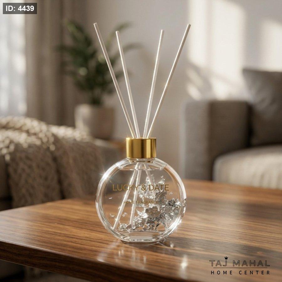 معطر منزلي (Home Fragrance) برائحة "Blue Campanula" (الجريس الأزرق) من العلامة التجارية Lucky & Date. يتميز هذا المعطر بوجود رقائق فضية تسبح داخل السائل في زجاجة كروية الشكل ذات سدادة ذهبية.