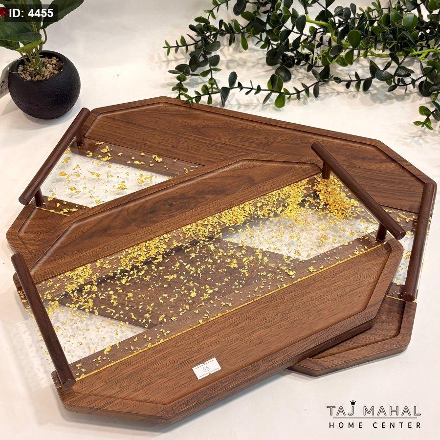 طقم صواني تقديم خشبية بتصميم سداسي الشكل مع تفاصيل ريزن شفافة ورقائق ذهبية ويد ذهبية