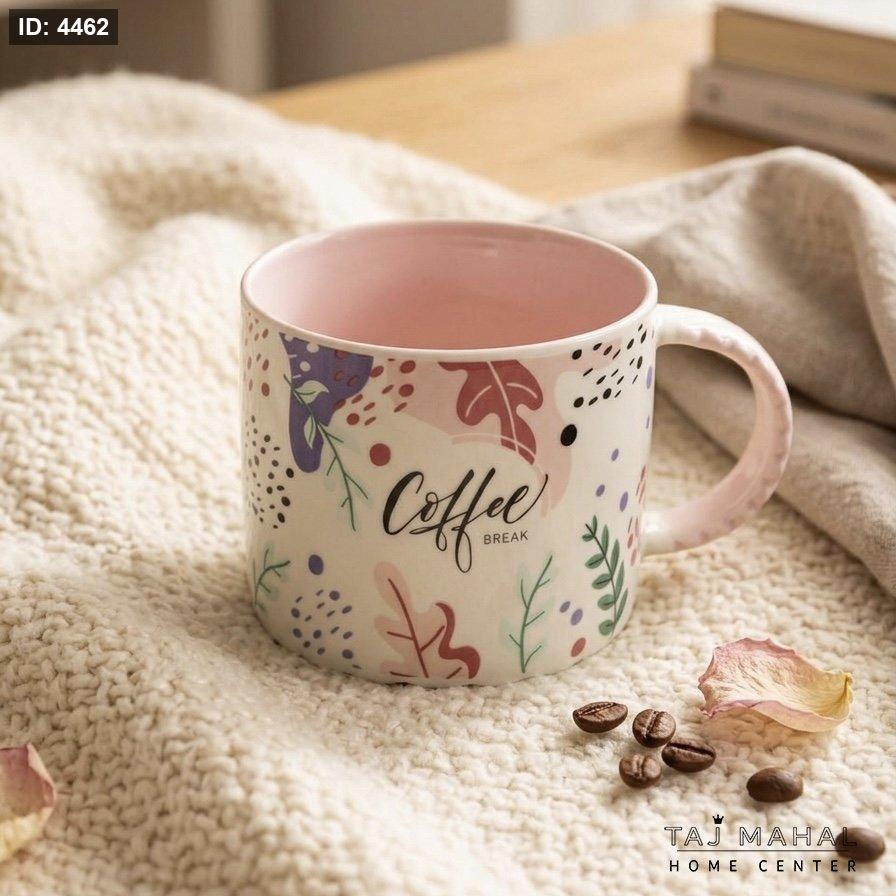 مج سيراميك مع عبارة Coffee Break ورسومات أوراق شجر ملونة