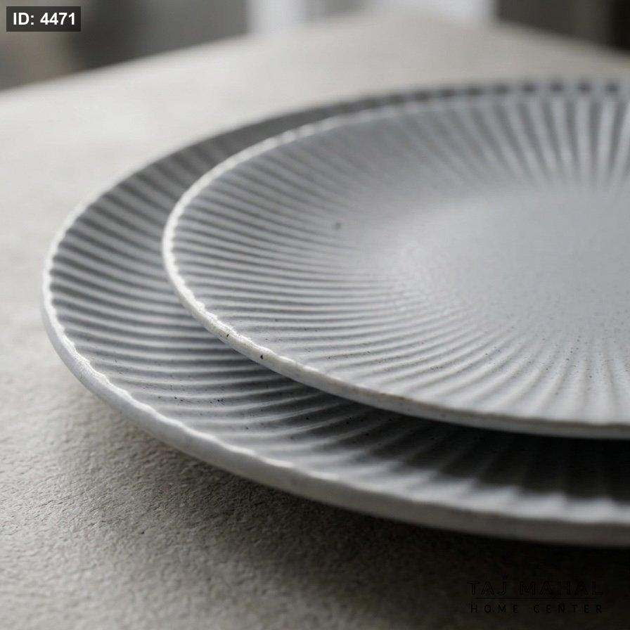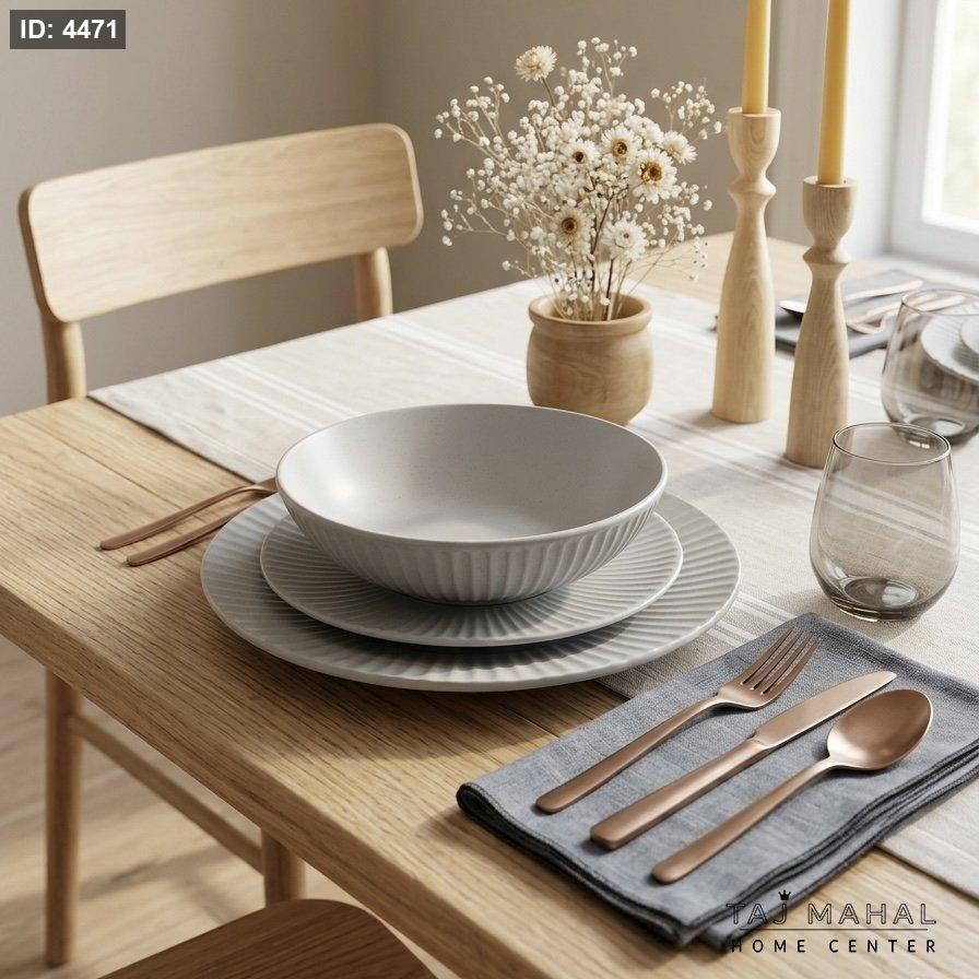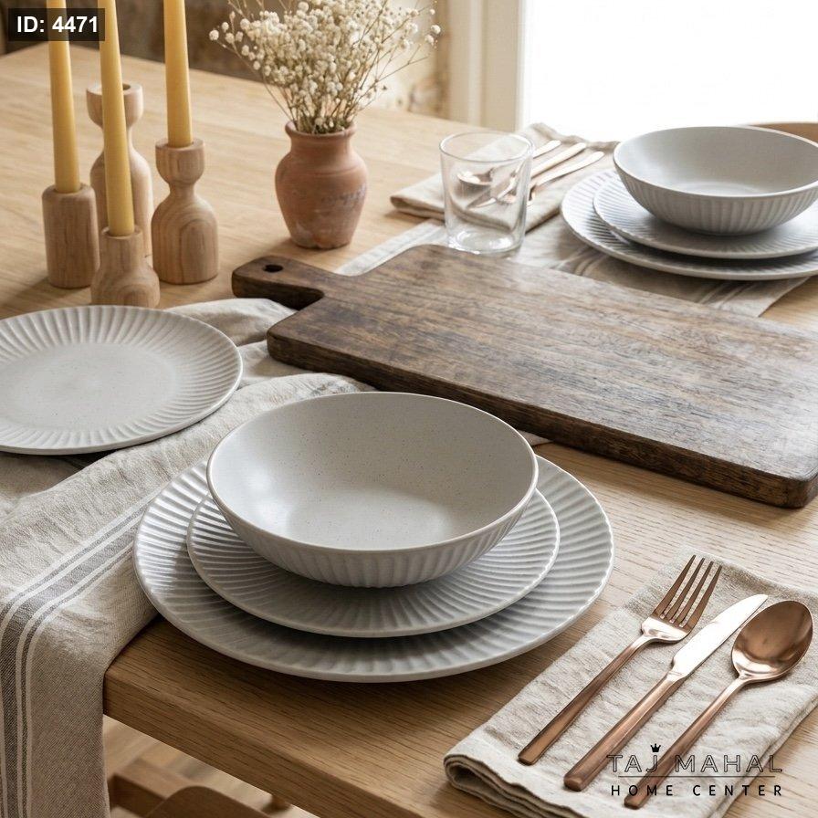أضف لمسة من الرقي العصري لسفرتك مع هذا الطقم المصنوع من السيراميك الحجري (Stoneware) عالي الجودة. يتميز بتصميمه المضلع (Striated) ولونه الرمادي الهادئ الذي يناسب كافة المناسبات، من الوجبات اليومية إلى العزومات الخاصة.