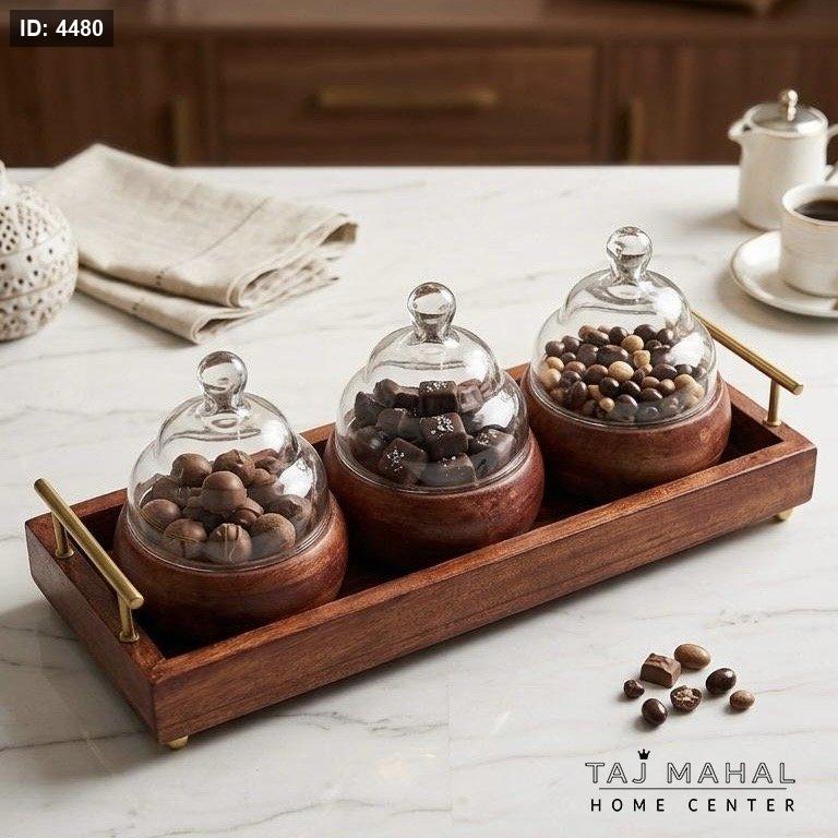 مضيفة خشبية ٣ قطع مع غطاء زجاجي وقاعدة لتقديم الحلويات