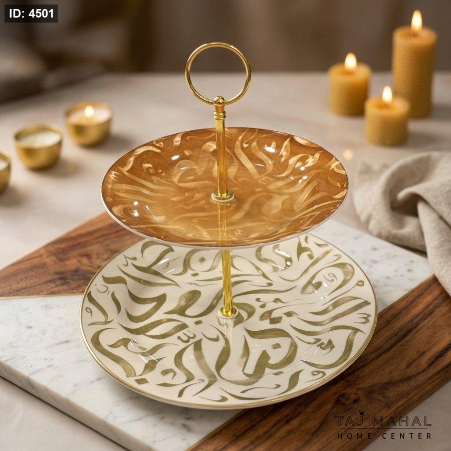 مضيفة طبقتين بورسلان بنقوش بالخط العربي مع حامل معدني ذهبي