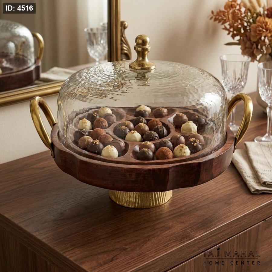مضيفة تقديم خشب هندي مع غطاء زجاجي شفاف وتفاصيل من النحاس المذهب