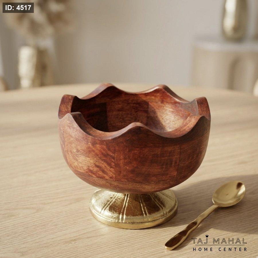 جاط عميق خشب هندي بقاعدة معدنية ذهبية وحواف متموجة مع معلقة ذهبية