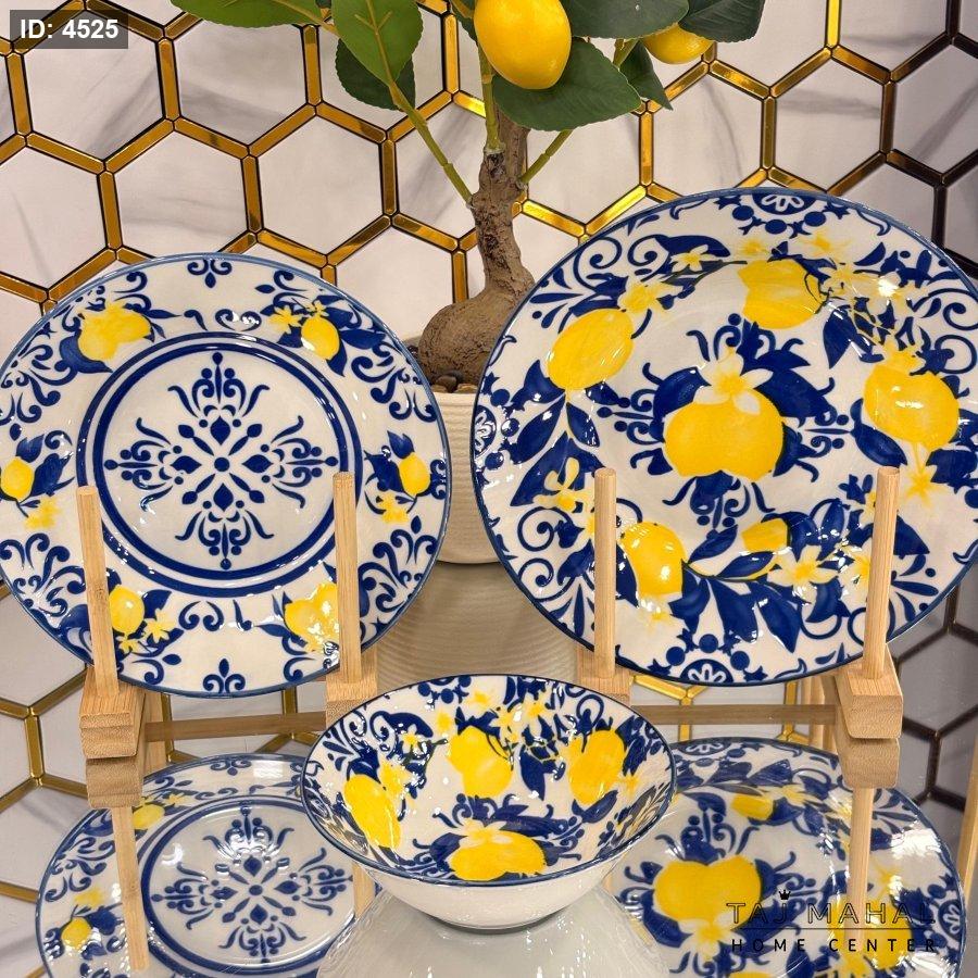 طقم سفرة عصري من البورسلان عالي الجودة، يتميز بنقوش الليمون والزخارف الزرقاء الأنيقة، يجمع بين المتانة وجمال التصميم المتوسطي.