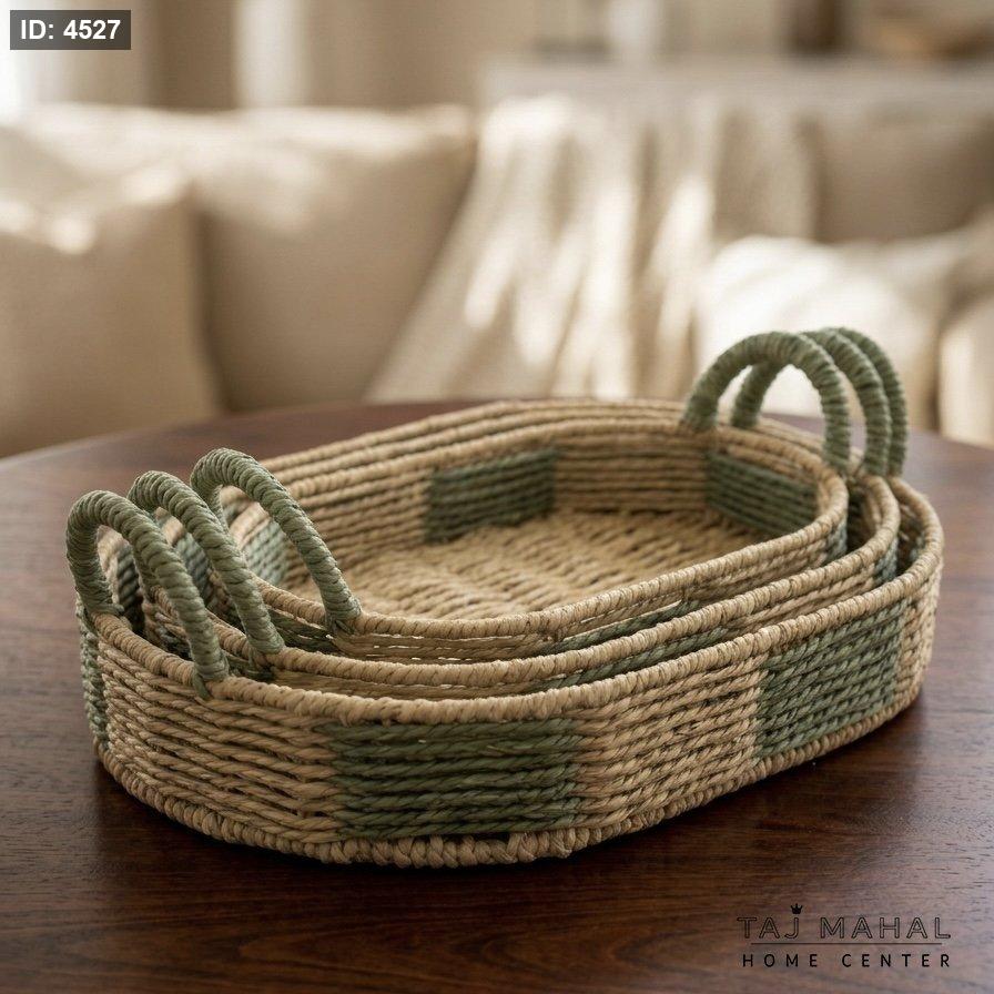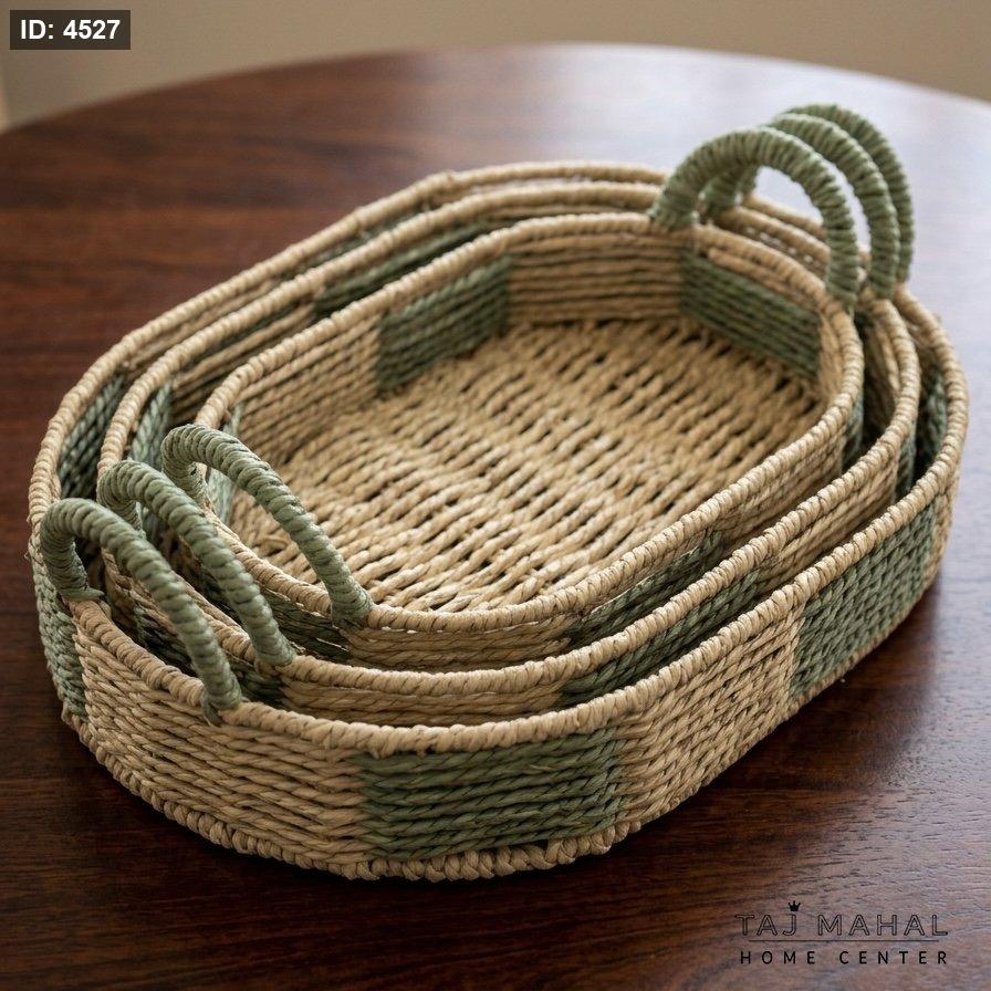 طقم صواني قش بيضاوية الشكل لون بيج وأخضر