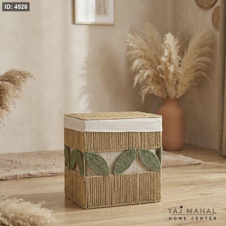منسوجة يدوياً من حبال الورق المتينة، تتميز بتصميم مزين بأوراق شجر خضراء ومبطنة بقماش أبيض قابل للإزالة والغسل. مثالية لتنظيم الغسيل، الألعاب، أو كديكور فاخر لتنسيق الهدايا (الدبش).