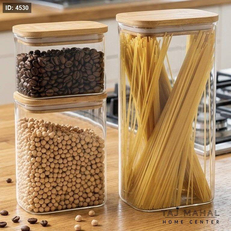 طقم علب تخزين زجاجية مع غطاء خشبي ٣ قطع