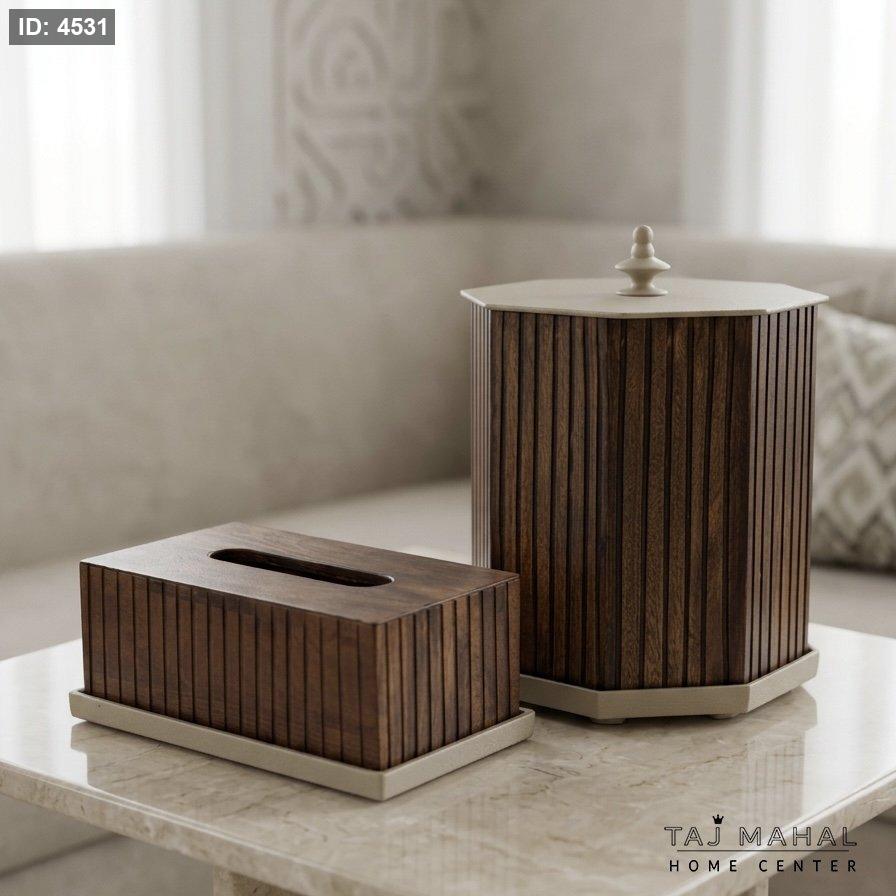 طقم أنيق وعصري يتكون من سلة مهملات ثمانية الأضلاع وعلبة مناديل مستطيلة، يجمع تصميمهما بين دفء الخشب الهندي الطبيعي المخطط وحداثة الألمنيوم باللون البيج الرملي المطفي (Matte) في القواعد والأغطية، مما يمنحهما مظهراً فخماً يناسب المجالس المودرن والكلاسيكية.