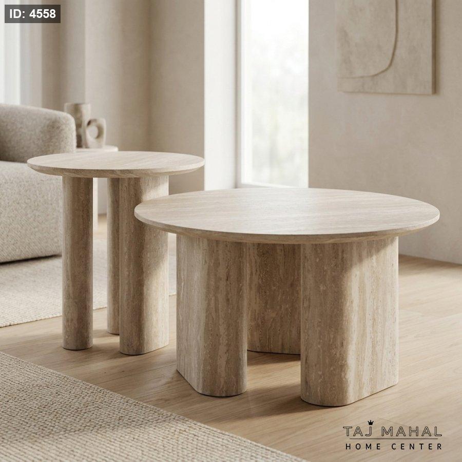 طاولات وسط بتصميم عصري بسطح خشب حجري وقواعد أسطوانية