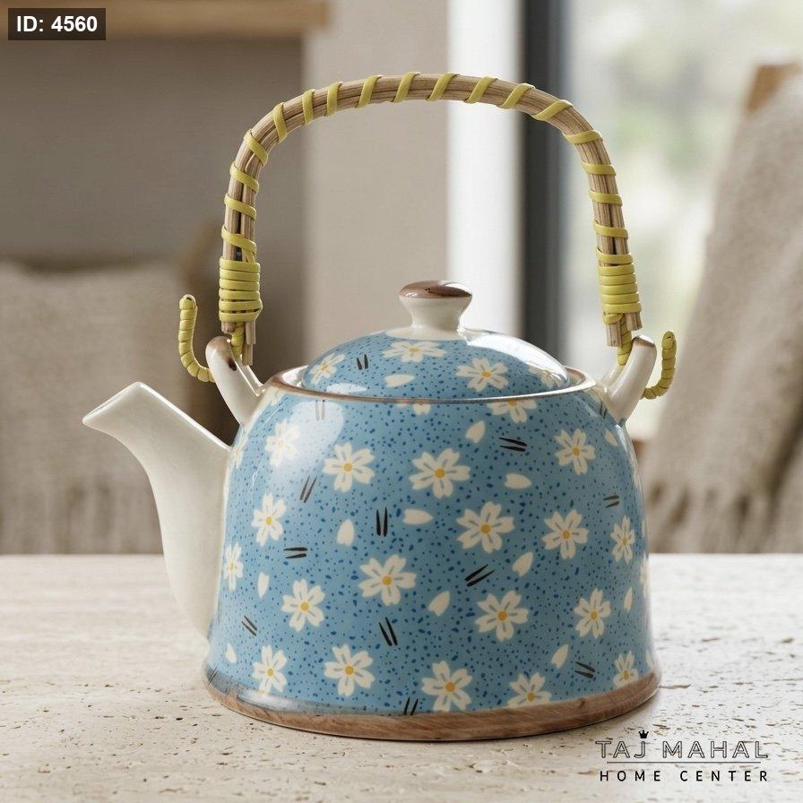 إبريق شاي سيراميك ازرق بنقوش زهور بيضاء مع مصفاة داخلية ويد خشب