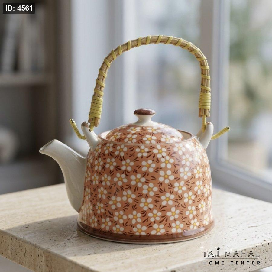 إبريق شاي سيراميك برتقالي بنقوش زهور بيضاء مع مصفاة داخلية ويد خشب