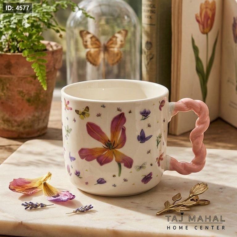 مج سيراميك ابيض برسوم زهور وفراشات مع يد باللون الوردي