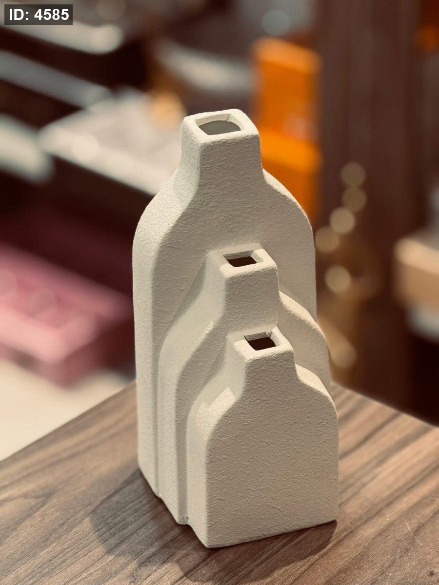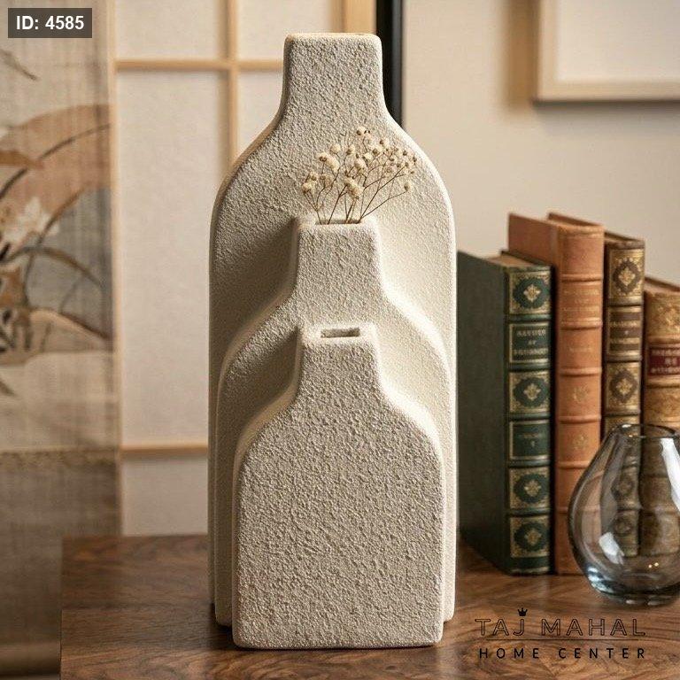 مزهرية سيراميك بوهيمية بتصميم مبتكر يدمج ثلاث فازات في قطعة واحدة متدرجة. تتميز بملمس رملي مطفي يضيف لمسة فنية دافئة وعصرية لمساحتك