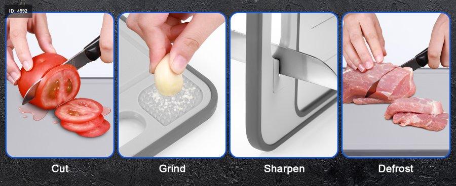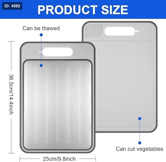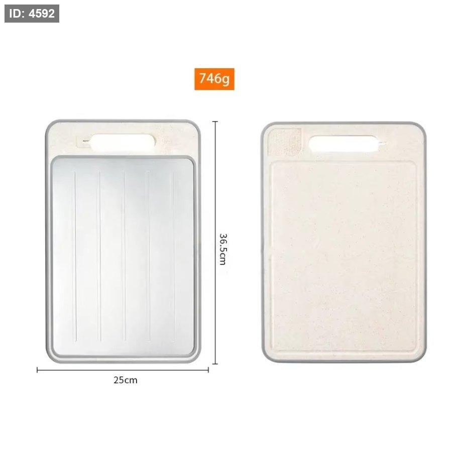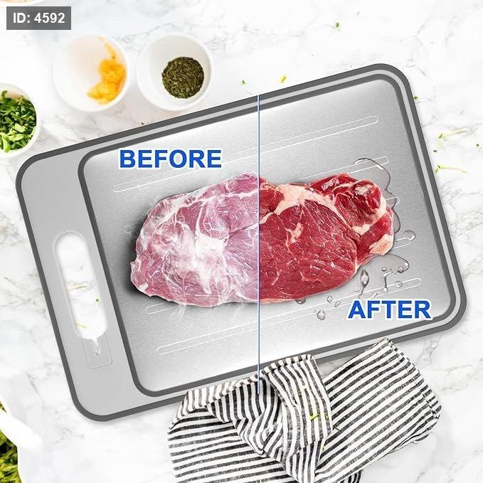 لوح المطبخ المتكامل (4 في 1): هو أداة مطبخ مبتكرة تجمع بين وظيفتي التقطيع وإذابة التجميد في وقت واحد. صُمم السطح المعدني بتقنية توزيع الحرارة لتسريع فك تجميد اللحوم، الدواجن، والأسماك في نصف الوقت المعتاد تقريباً، وبدون استخدام كهرباء أو ميكروويف، مما يحافظ على جودة الطعام وقيمته الغذائية.