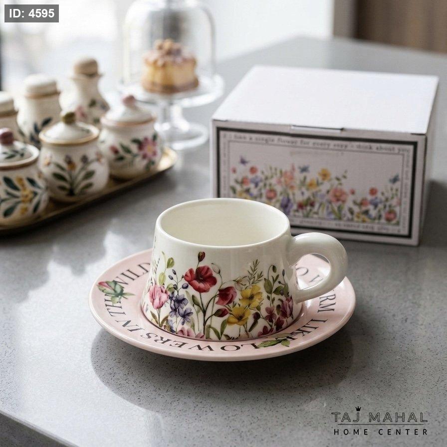 مج سيراميك مع صحن وردي بنقوش زهور ملونة