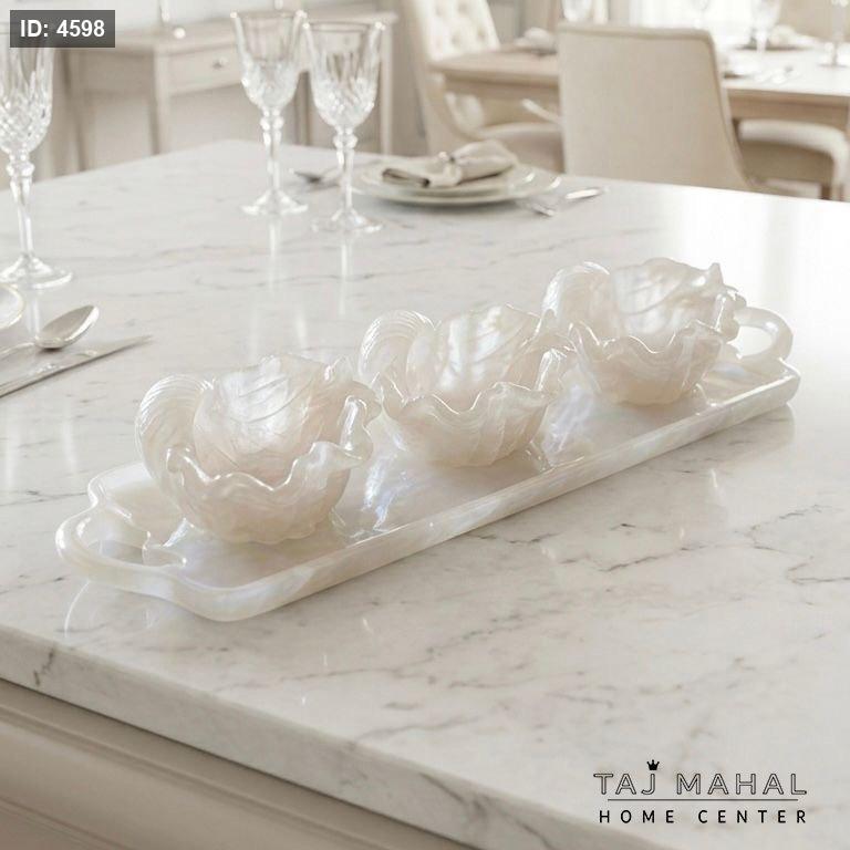 صينية وثلاث صحون اكريليك بشكل صدف متموج بلون أبيض لؤلؤي