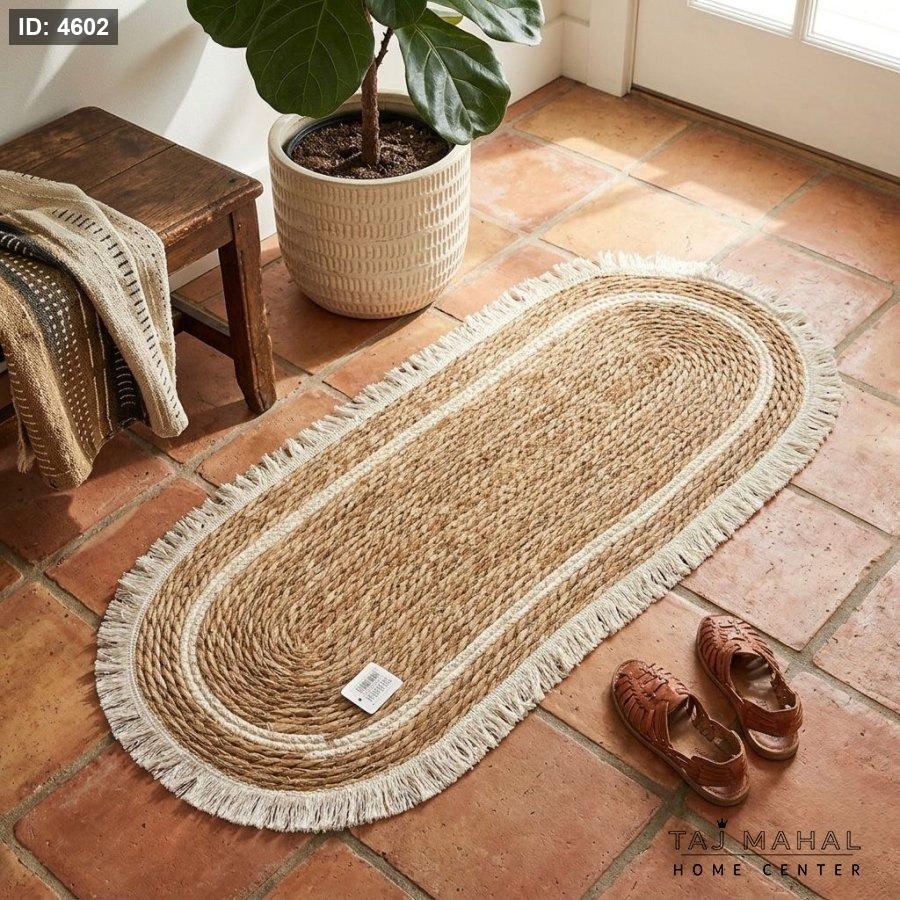 سجادة بيضاوية من القش بأسلوب بوهيمي ريفي وشراشيب بيضاء على الحواف