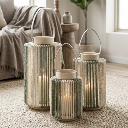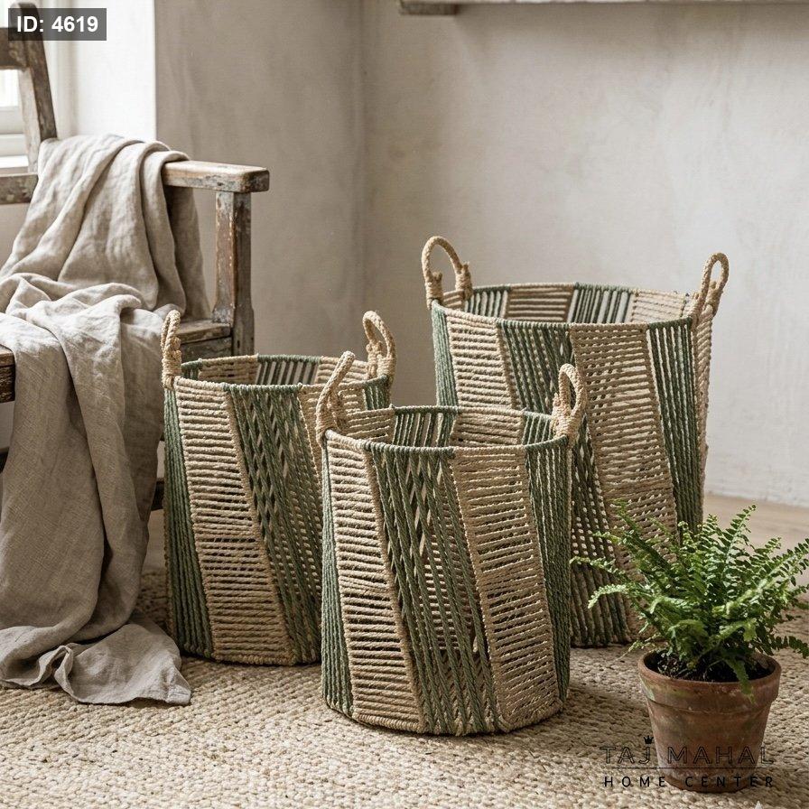 طقم سلال تخزين بهيكل قش مخطط بلون بيج وأخضر