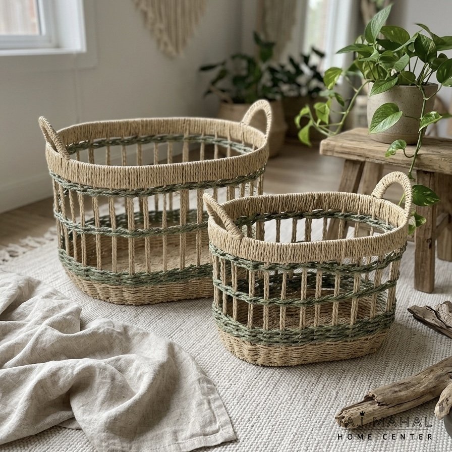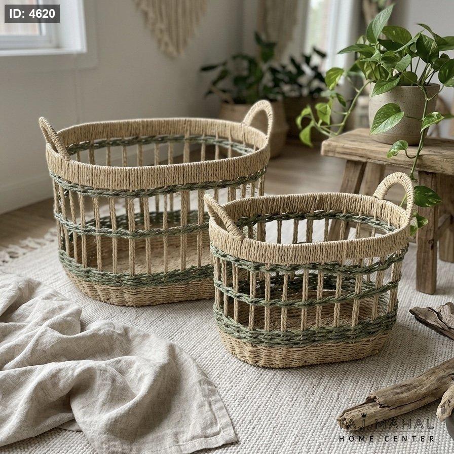 طقم سلال قش بيضاوية متعددة الاستخدامات بلون بيج واخضر