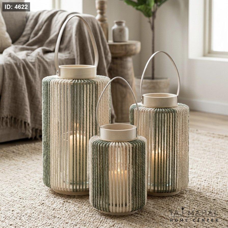 طقم فوانيس دائرية من خيوط القش بألوان طبيعية بيج وأخضر بمقابض جلدية وحامل زجاجي داخلي للشموع