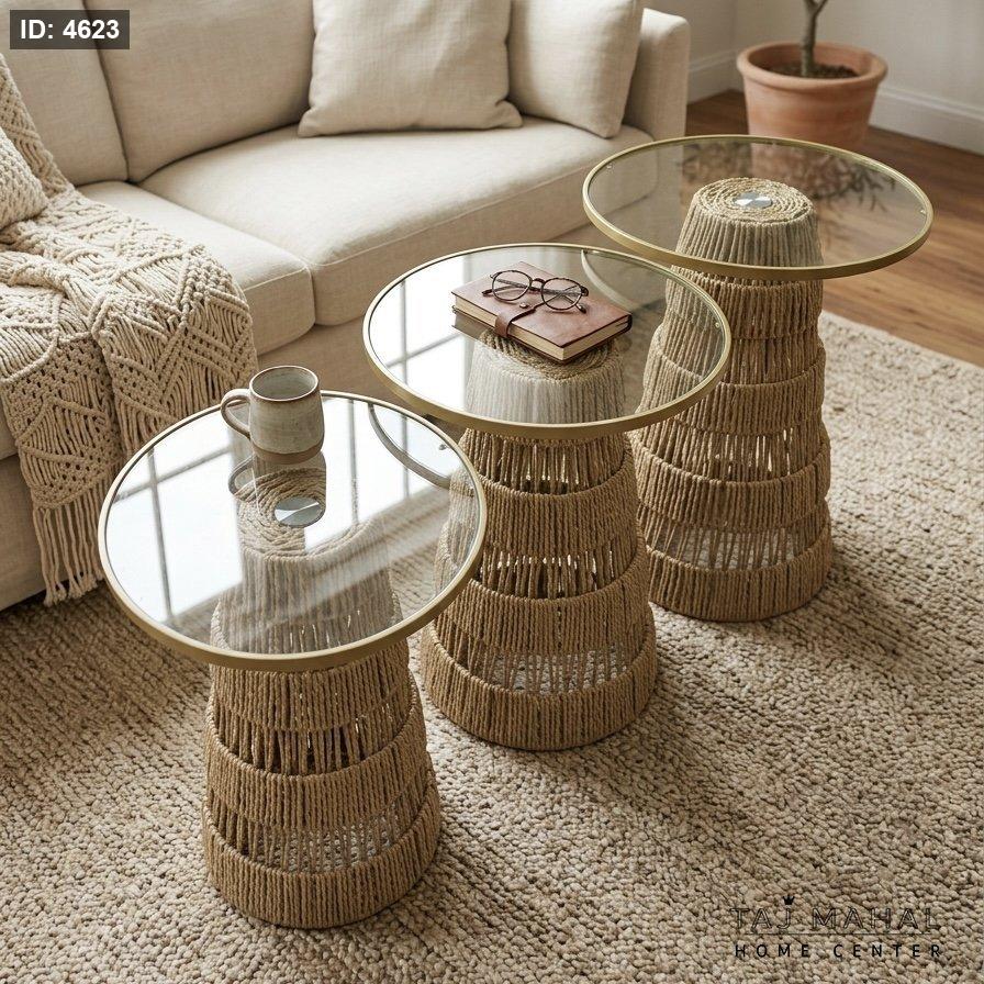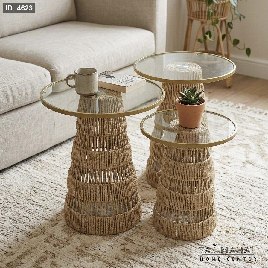 طقم طاولات وسط بقاعدة من القش المجدول وإطار معدني ذهبي مع سطح زجاجي