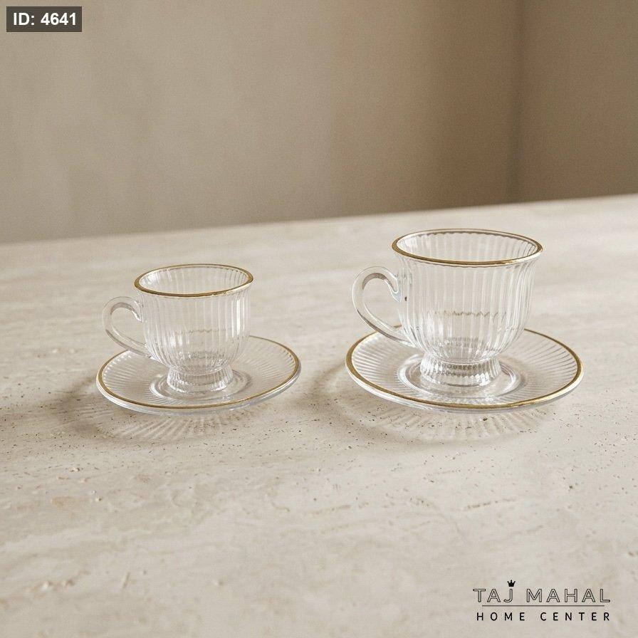 طقم فناجين شاي وقهوة زجاجي شفاف مخطط مع حافة ذهبية ١٢ قطعة