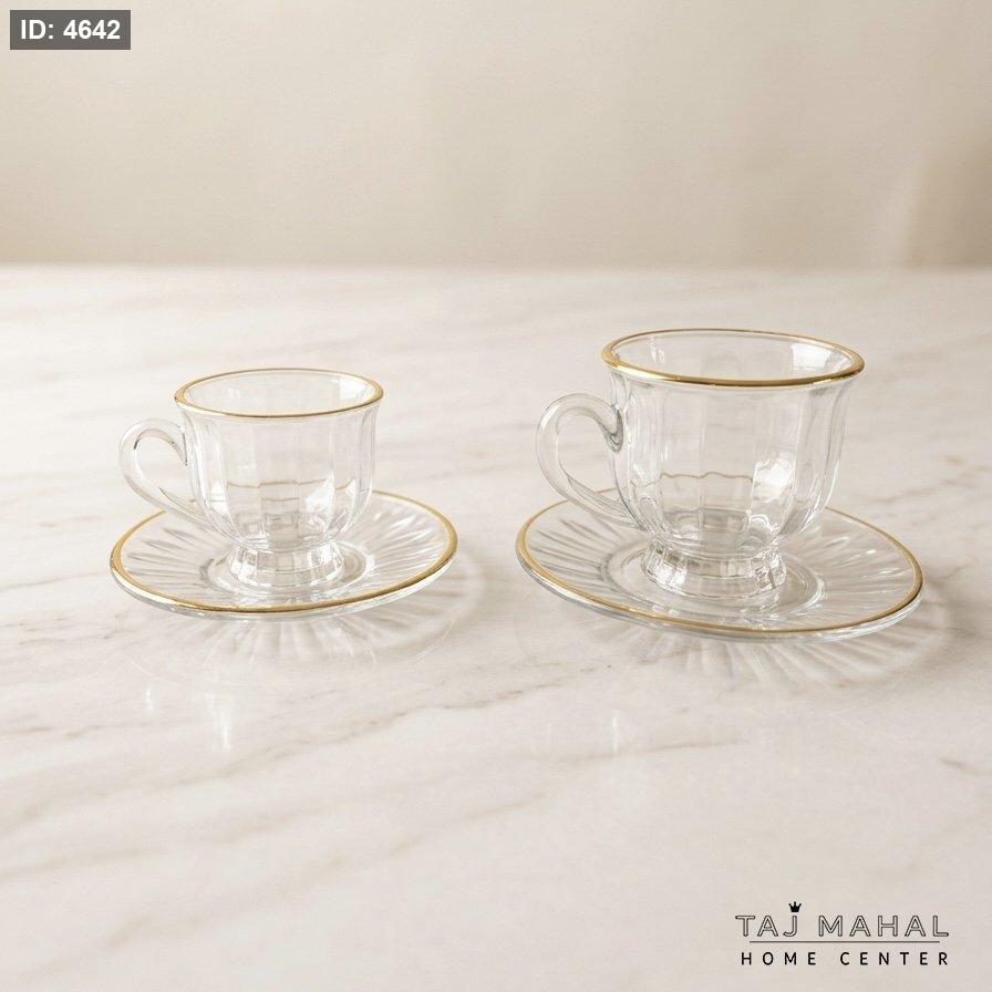 طقم فناجين شاي وقهوة زجاجي منقش مع حافة ذهبية ١٢ قطعة
