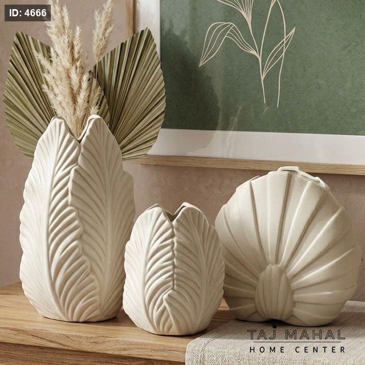 طقم فازات سيراميك أبيض بتصميم أوراق شجر وصدفة