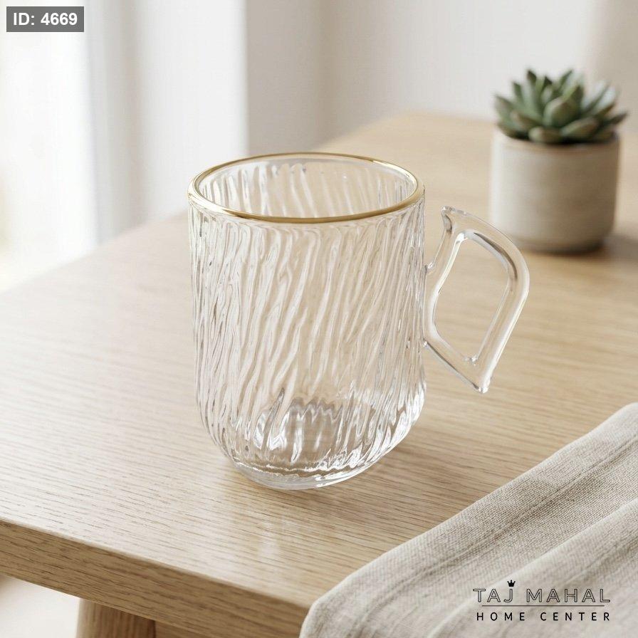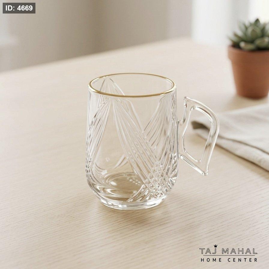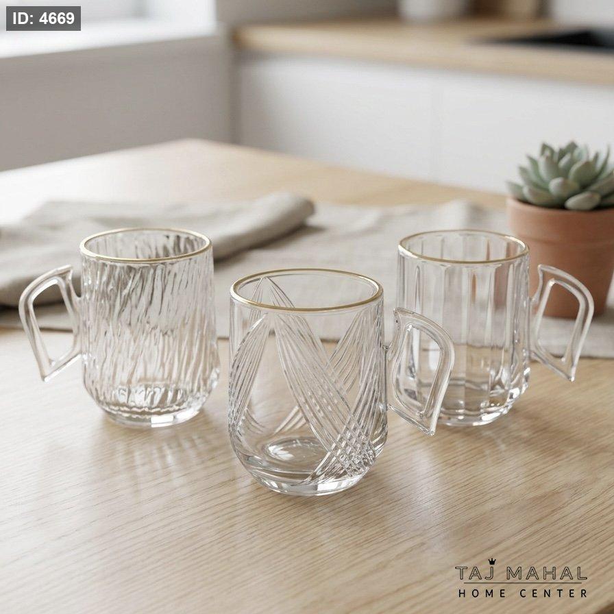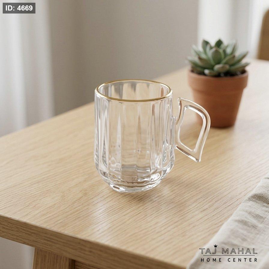 أكواب زجاجية فاخرة بتصميم عصري وحواف ذهبية أنيقة، مثالية لتقديم الشاي والقهوة والنسكافيه بأسلوب راقٍ.
