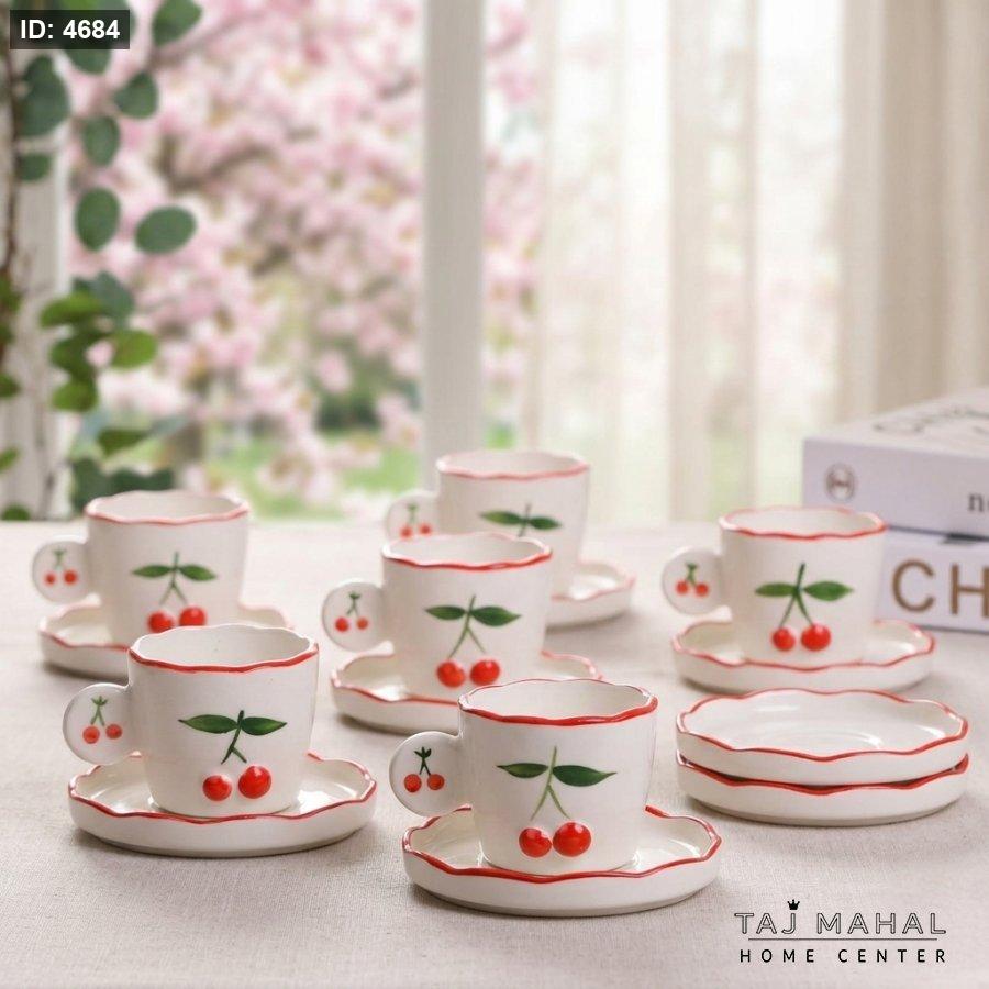 أضيفي لمسة من الحيوية والجمال لضيافتك مع هذا الطقم المميز المصنوع من البورسلان الأبيض عالي الجودة. يتميز التصميم بنقشة حبات الكرز الحمراء اللطيفة التي تمنح روتينك اليومي أو جلسات الضيافة طابعاً ريفياً عصرياً مبهجاً.