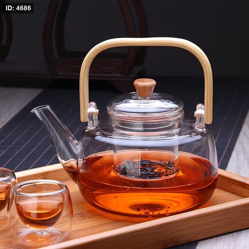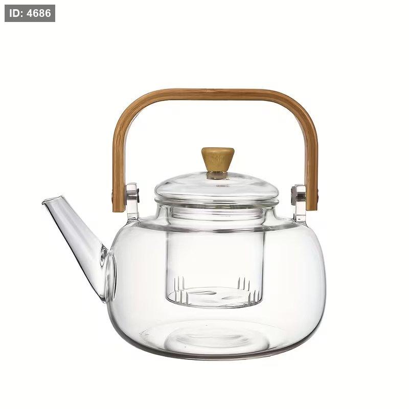 إبريق شاي زجاجي حراري بيد خشب ومصفاة داخلية للأعشاب والشاي