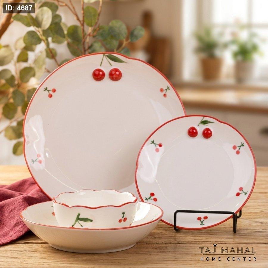 أضيفي لمسة من الحيوية والأناقة الريفية إلى مائدتك مع هذا الطقم الفاخر. يتميز بتصميم عصري يجمع بين بياض البورسلان الناعم ونقشات الكرز الأحمر المبهجة، مما يجعله مثاليًا للاستخدام اليومي أو للمناسبات الخاصة.
