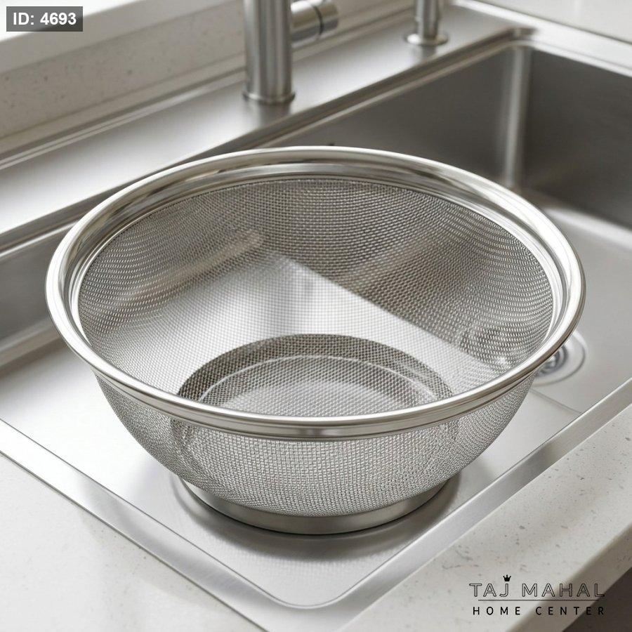 مصفاة مطبخ دائرية مصنوعة من الستانلس ستيل، بقطر 25 سم. تتميز بحواف مرتفعة وتصميم شبكي ناعم، مما يجعلها مثالية لغسل وتصفية كميات متوسطة إلى كبيرة من الأرز، الخضروات، أو الفواكه بفعالية.